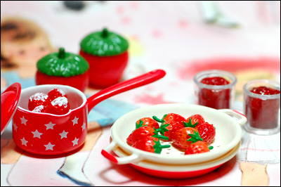 イチゴ型容器とジャムが2個ずつある上にジャムのふたが3つあった…